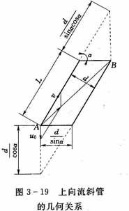 以上向流斜管沉淀池為例,分析沉淀區(qū)斜管尺寸問題,下向流斜管斜板沉淀池原理與此相同,不多敘述。為了分析方便,取上向流斜管為矩形,斜管的縱剖面如圖3-19所示;